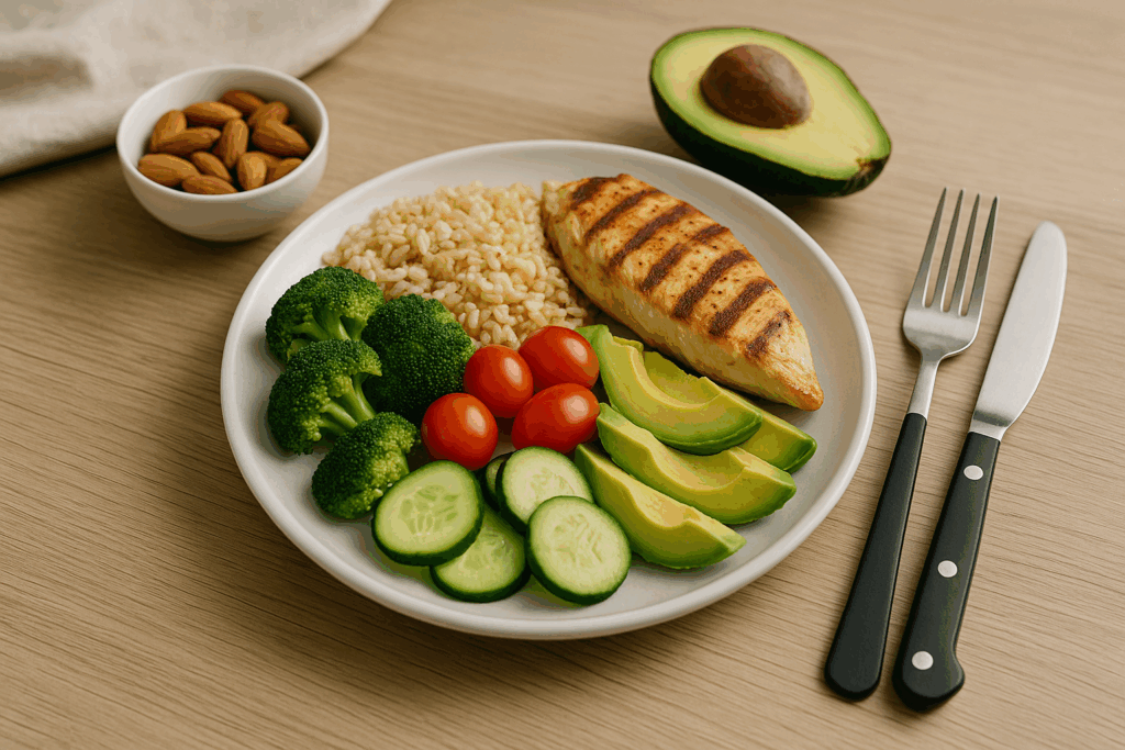 Grilled chicken + brown rice + steamed broccoli + water or a smoothie